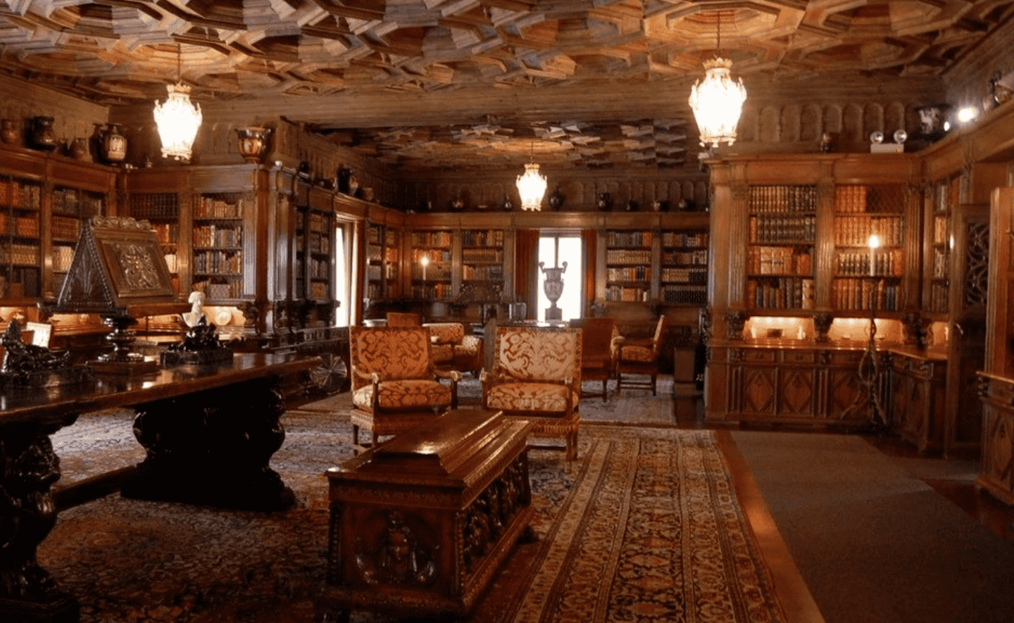 William Randolph Hearst có hai thư viện trong ngôi nhà (lâu đài) của mình: thư viện chính chứa 4.000 cuốn sách, phòng làm việc theo phong cách Gothic chứa 3.000 cuốn. Dường như ngay cả khi có hai không gian rộng cũng không đủ chỗ cho tất cả sách của ông. Đó là lý do "ông trùm báo chí" để sách bất cứ nơi nào có thể tìm thấy chỗ trống.